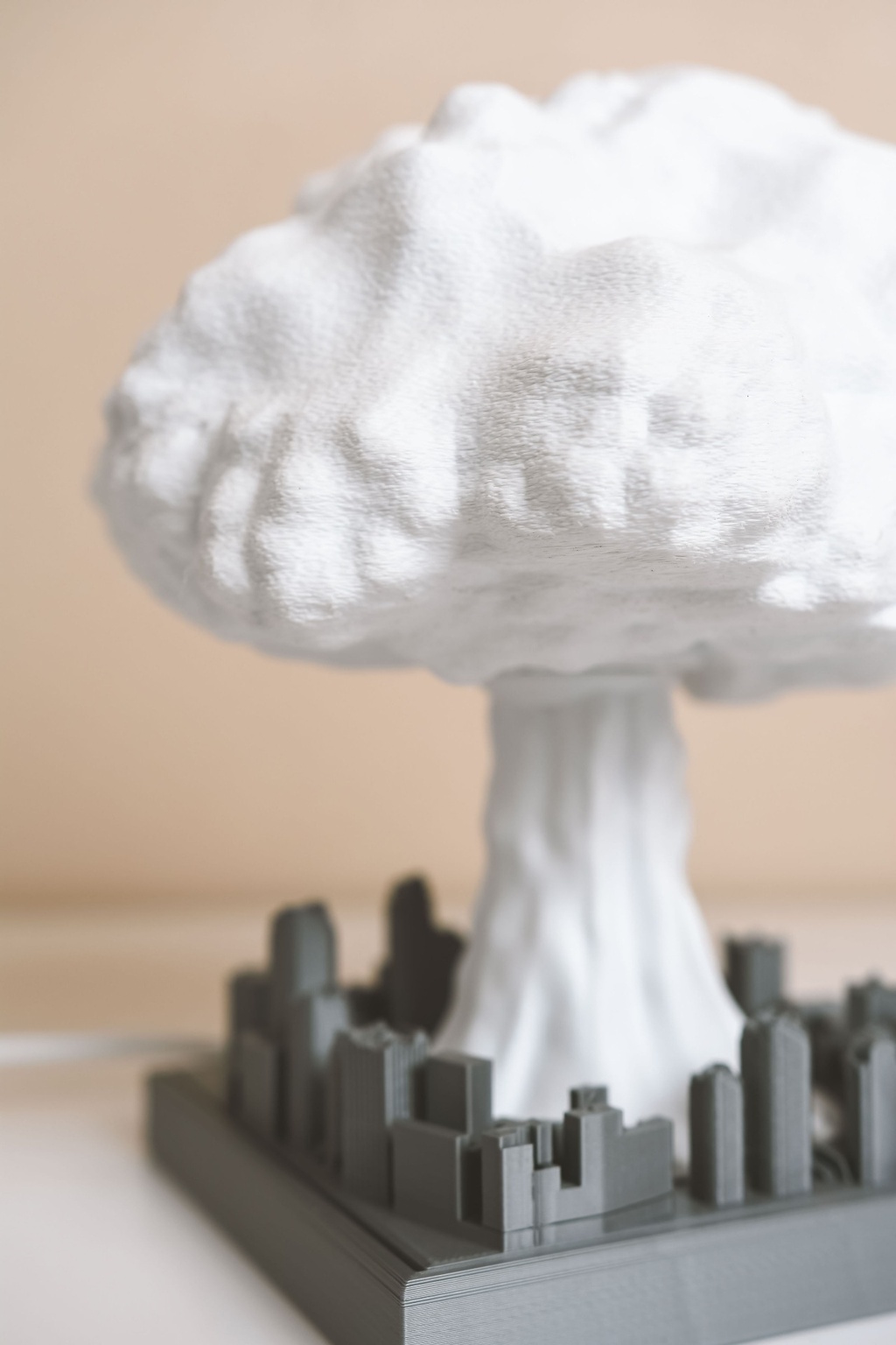 Lámpara Explosión NuclearIlumina tu espacio con la Lámpara de Mesa Explosión Nuclear, una pieza excepcional que simula la forma de un hongo nuclear, aportando un toque audaz y moderno a tu decoración.Realizada íntegramente mediante impresión 3D en plástico, esta lámpara no solo es un elemento funcional, sino también una obra de arte que atraerá todas las miradas. Su diseño único y contemporáneo destaca por su acabado minimalista, ideal para cualquier ambiente.Características:Iluminación cálida: Incluye una luz LED bipin cálido de 6 watts, que proporciona una atmósfera acogedora y agradable.Dimensiones: Alto 27 cm, ancho 23 cm y profundidad 23 cm (aprox), perfecta para cualquier rincón de tu hogar.Transforma tu espacio con esta lámpara innovadora. ¡Hazte con la Lámpara Explosión Nuclear y añade un toque de originalidad a tu decorado!